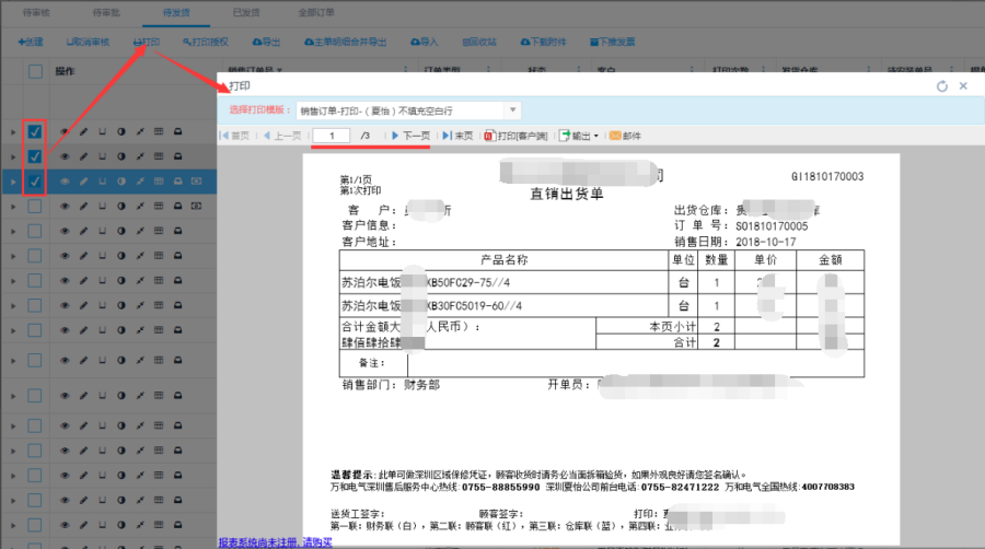 第一步:在左侧多选框,选中销售订单,再点击列表上方<打印>按钮后弹出打印框。
