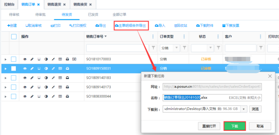 点击列表上方的<主单明细合并导出>按钮可导出销售订单列表内容。