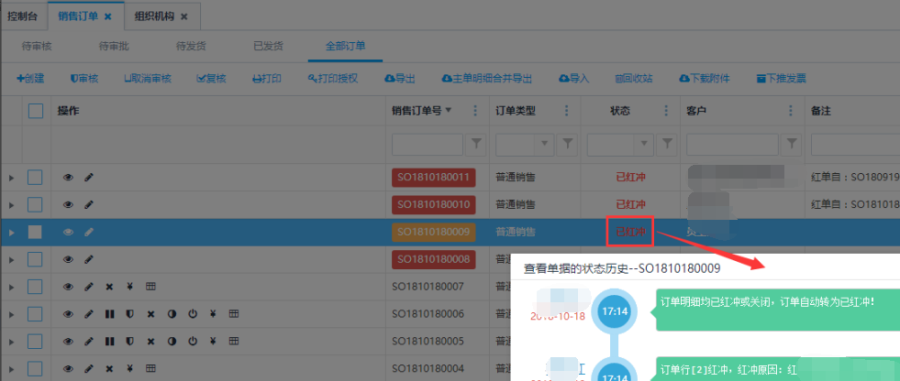 点击状态查看,可以查看该单据的状态历史和操作的原因,例如:红冲原因。
