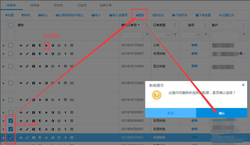 制单状态下的销售订单,可以点击操作栏的<删除>按钮,对订单进行删除操作;也可以勾选左边的多选框后点击列表上方<删除>按钮进行批量删除。订单删除成功后会生成到"回收站"里,回收站里的订单只可查看。