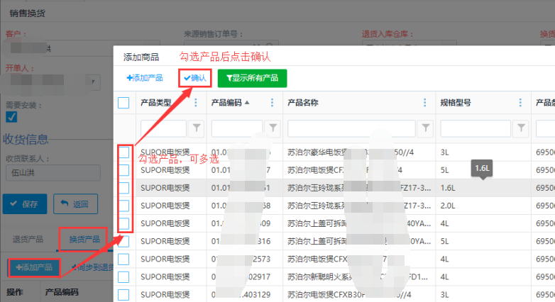 第三步:在"换货产品"分页添加产品,选中所需添加的产品再点击左上方<添加产品>按钮既可添加产品并可以继续添加产品,如不需继续添加产品,可点击左上方<确认>按钮,既可将之前所有添加的产品添加到销售列表。