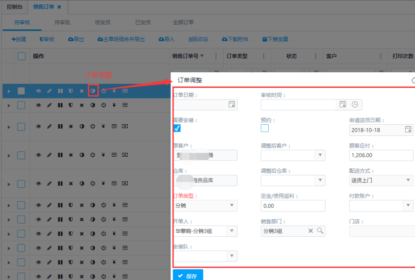 制单状态下的销售订单,可以点击<订单调整>按钮,可对订单进行订单调整操作,订单调整包括订单日期、审核日期、调整后客户、调整后仓库、付款账号等信息。