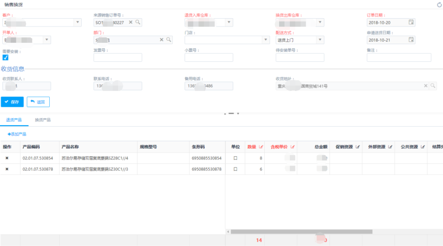 - 有来源销售订单号时,销售换货界面的退货产品显示该销售订单的产品,不能继续添加产品;换货产品则没有限制。