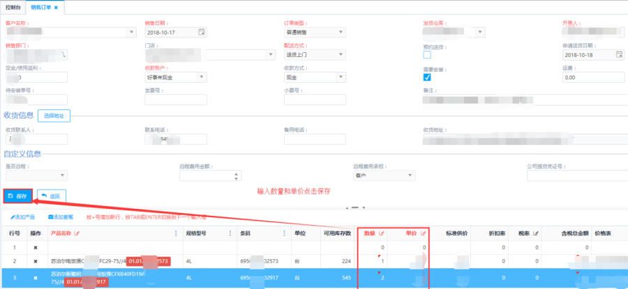 第四步:补全订单产品明细信息,点击<保存>按钮,完成销售订单创建。