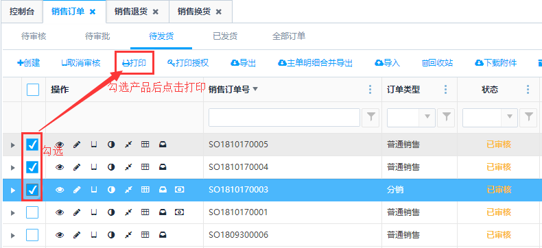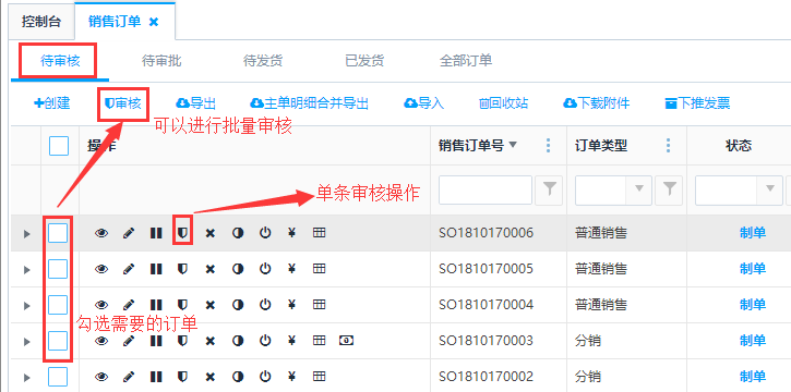 制单状态下的销售订单,可在操作栏点击<审核>按钮,对订单进行审核;也可以勾选左边的多选框后点击列表上方<审核>按钮进行批量审核。