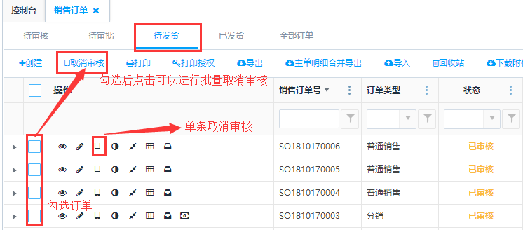 订单审核后,订单就会生成到"待发货"列表里,状态成为"已审核"状态,可以点击操作栏<取消审核>按钮,对订单进行取消审核操作,也可以勾选左边的多选框后点击列表上方<取消审核>按钮进行批量取消审核。