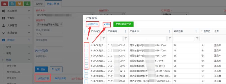 第三步:选中所需添加的产品再点击左上方<添加产品>按钮既可添加产品并可以继续添加产品,如不需继续添加产品,可点击左上方<确认>按钮,既可将之前所有添加的产品添加到销售订单。