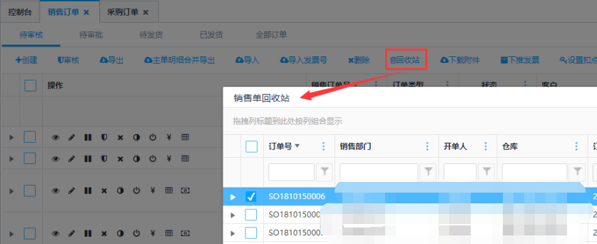 点击列表上方<回收站>按钮可查看被删除的销售订单历史数据,回收站里的订单只可查看。