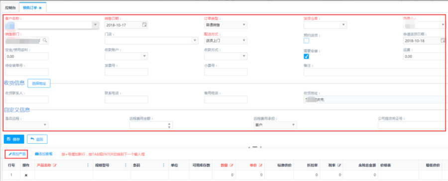 第二步:编辑销售订单内容,点击<添加产品>按钮添加销售订单产品明细。
