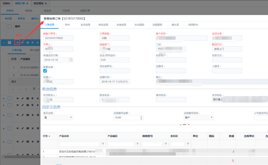 所有状态的订单,点击<查看>按钮,查看当前销售订单信息详情。界面内容:订单信息、附件、发货信息、物流信息、安装信息、状态跟踪、流程跟踪、备忘录和明细附件等相应的单号信息;也可以点击最左端的三角形按钮,直接查看订单的产品明细。