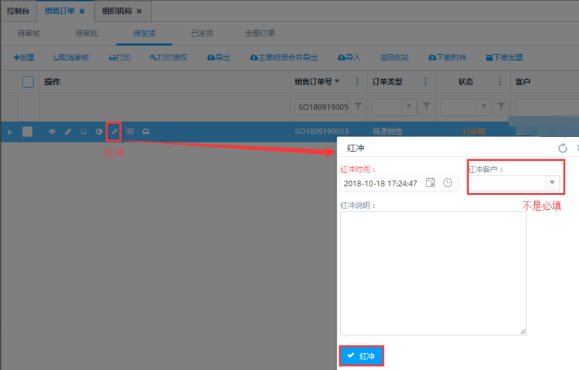 已审核状态的销售订单,可以点击<红冲>按钮,完成对订单的红冲操作。完成红冲操作后,系统删除出库单,并生成一条销售数据相反的销售订单,订单生成到"已发货"列表里,状态转为"已红冲"