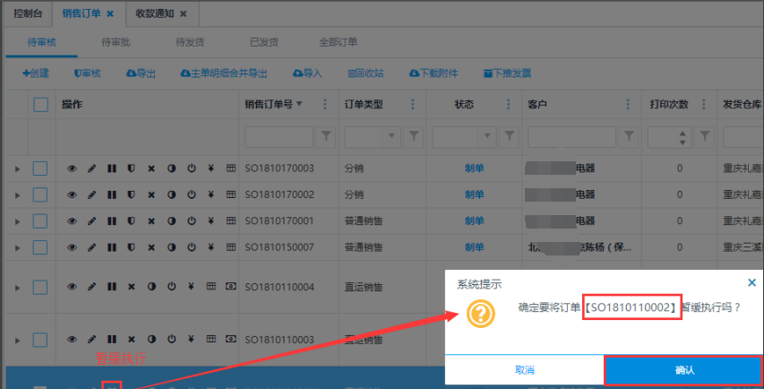 制单状态下的销售订单,可在操作栏点击<暂缓执行>按钮,对订单进行暂缓执行操作。暂缓执行后单据状态显示"暂缓执行",该单据可以延期处理,在全部订单中查看