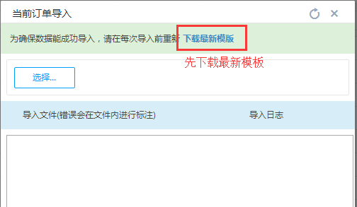 第二步:选择相应的模板导入销售订单,例如:选择【当前订单导入】,跳转到导入界面,然后点击【下载最新模板】,下载最新模板后按模版格式进行数据维护: