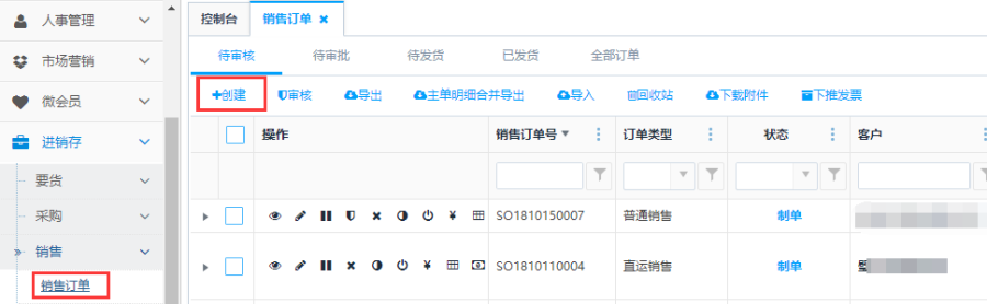 第一步:点击列表上方<创建>按钮,进入销售订单的创建页面。