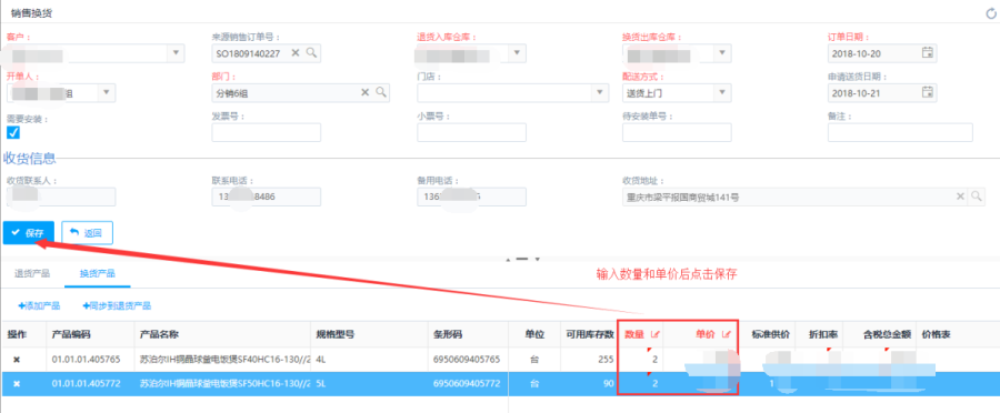 第四步:确认退货产品和换货产品的数量和单价,点击<保存>按钮,保存成功后销售订单单号后面显示"退"字并且在销售换货单中生成一条制单状态的销售换货记录。(从进销存-销售-销售换货处查看)