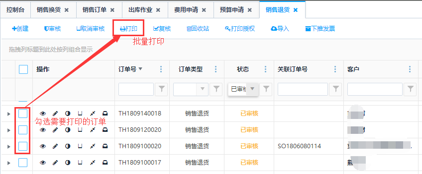 状态为制单的订单,可在销售退货首页操作栏点击<审核>,或点击左侧多选框选中多个销售退货单后,再点击列表上方<审核>按钮批量完成审核。