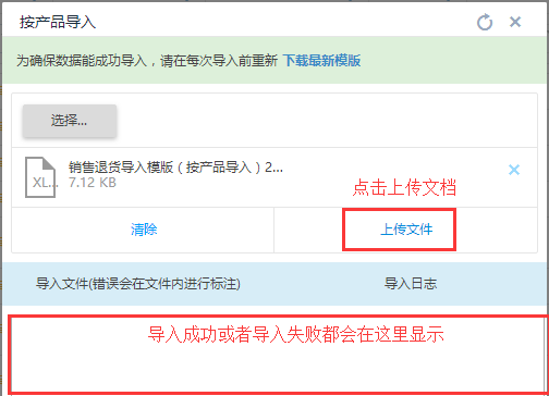 第二步:选择相应的模板导入销售退货单,例如:选择【按产品导入】,跳转到导入界面,然后点击【下载最新模板】,下载最新模板后按模版格式进行数据维护: