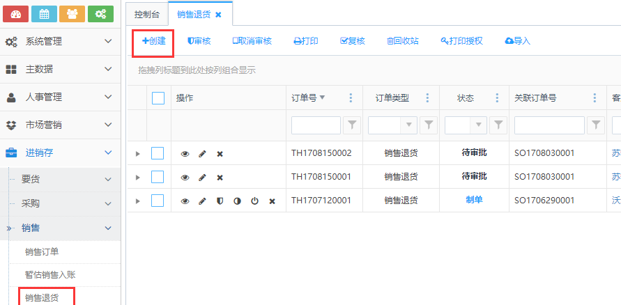 第一步:点击列表左上方<创建>按钮,进入销售退货的创建页面: