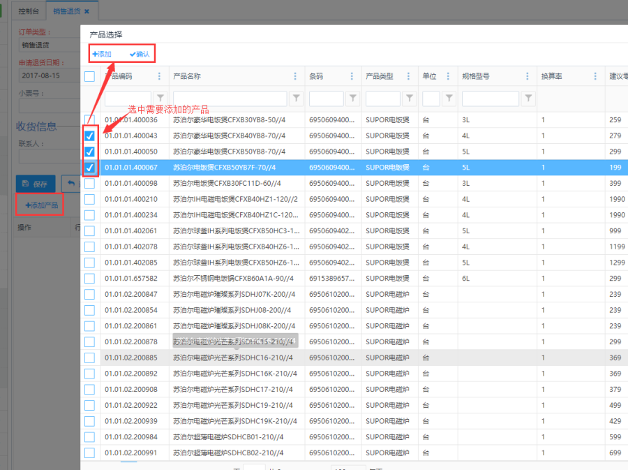 第三步:选中所需添加的产品再点击左上方<添加产品>按钮既可添加产品并可以继续添加产品,如不需继续添加产品,可点击左上方<确认>按钮,既可将之前所有添加的产品添加到销售退货单: