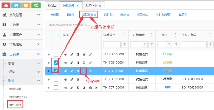 "已审核"状态的销售退货单,可以在首页操作栏点击<取消审核>按钮,或选中左侧多选框,再点击列表上方<取消审核>按钮,完成取消审核操作,单据状态会转为"制单"。
