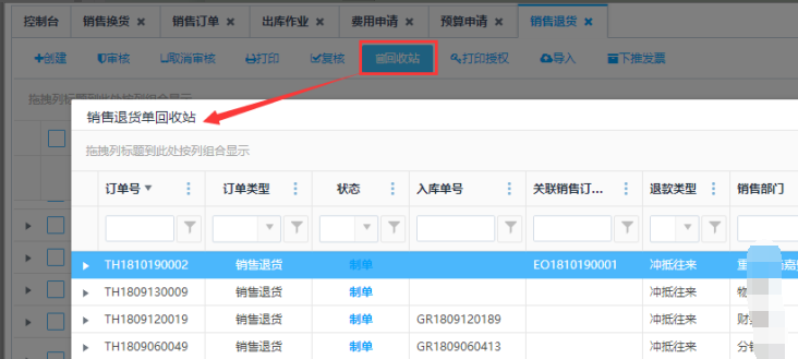 点击列表上方<回收站>按钮,可查看已删除的销售退货单历史记录。