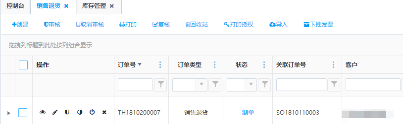 - 审核:制单状态下销售退货单,审核该销售退货单,审核后审核按钮置灰,不能点击;取消审核可点击操作;