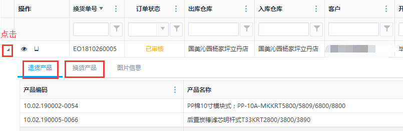 在"退货产品"分页列表:不能添加新的退货产品,只能编辑或删除当前退货产品的产品信息;在"换货产品"分页列表:可以添加新的换货产品,编辑或删除当前换货产品的产品信息
