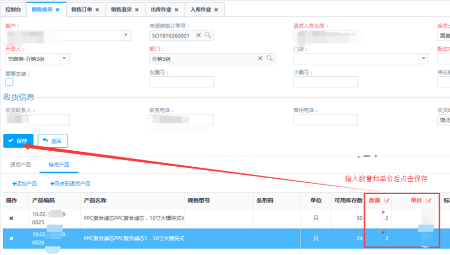 第四步:补全订单产品明细信息,点击<保存>按钮,完成销售换货单创建。
