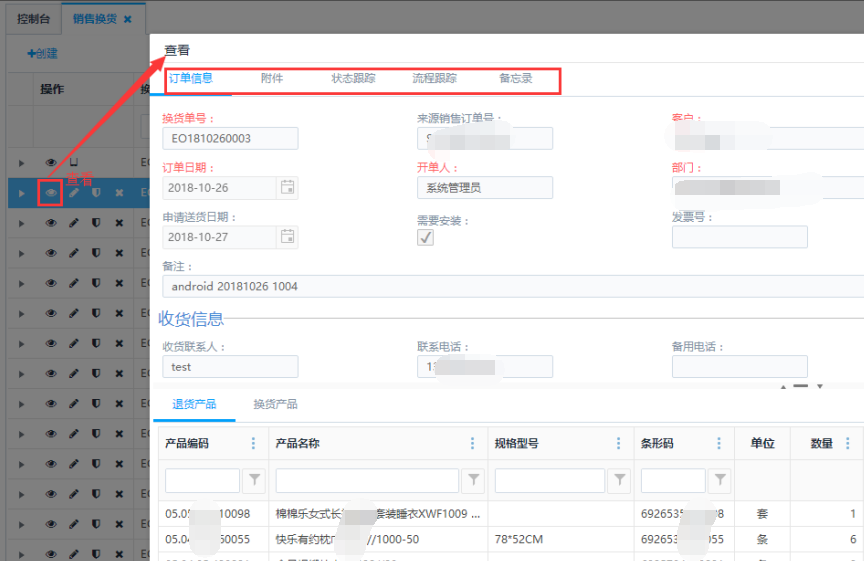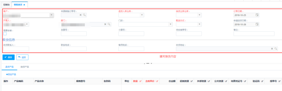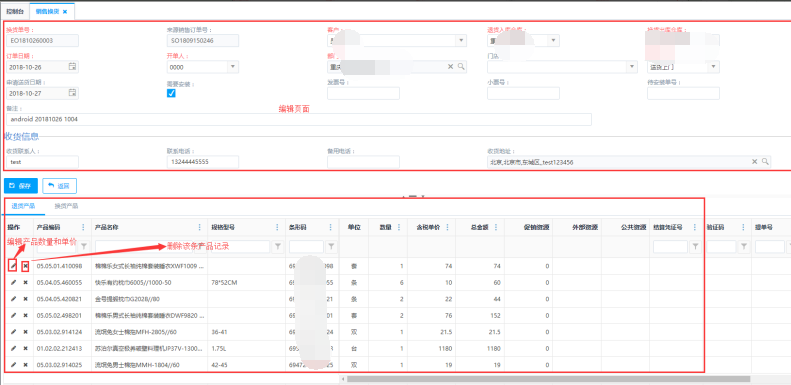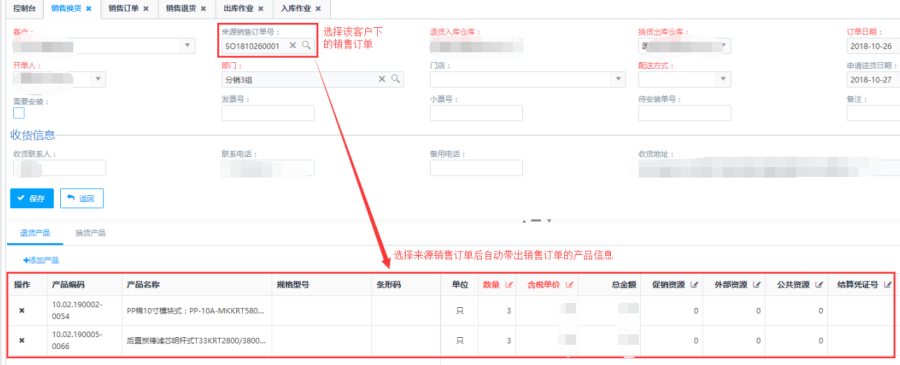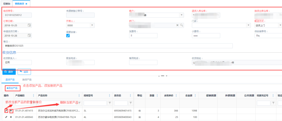 第二步:编辑销售换货订单内容,根据是否关联销售订单来进行添加退货产品明细;