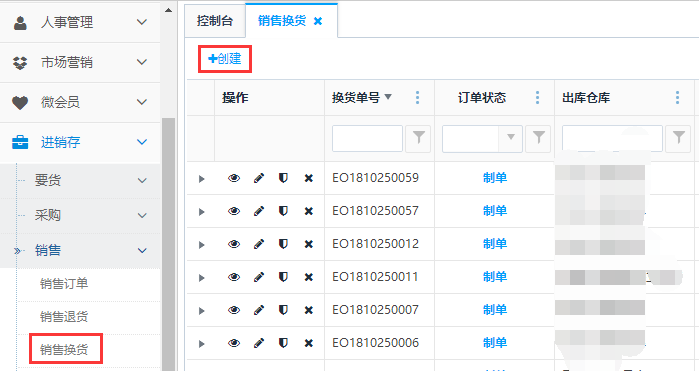 第一步:点击列表左上方<创建>按钮,进入销售换货的创建页面: