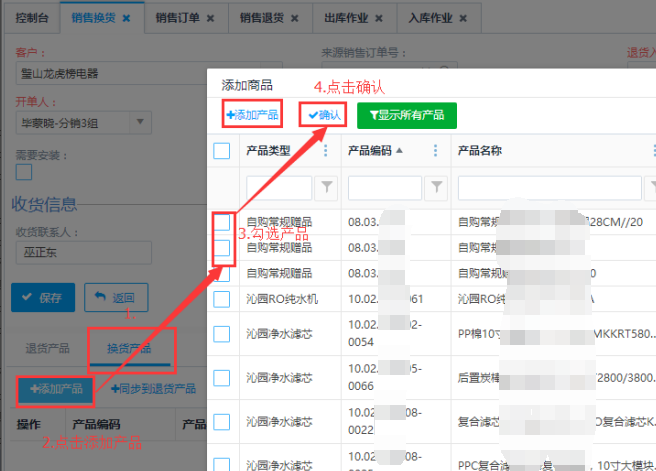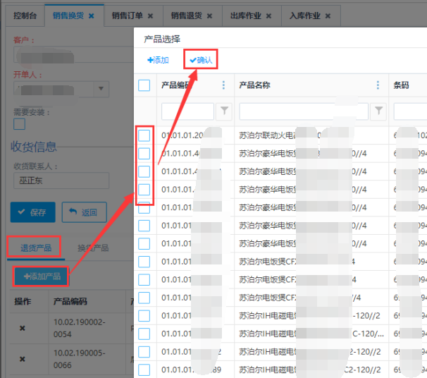 第三步:在"换货产品"分页列表,选中所需添加的产品再点击左上方<添加产品>按钮既可添加产品并可以继续添加产品,如不需继续添加产品,可点击左上方<确认>按钮,既可将之前所有添加的产品添加到销售换货单: