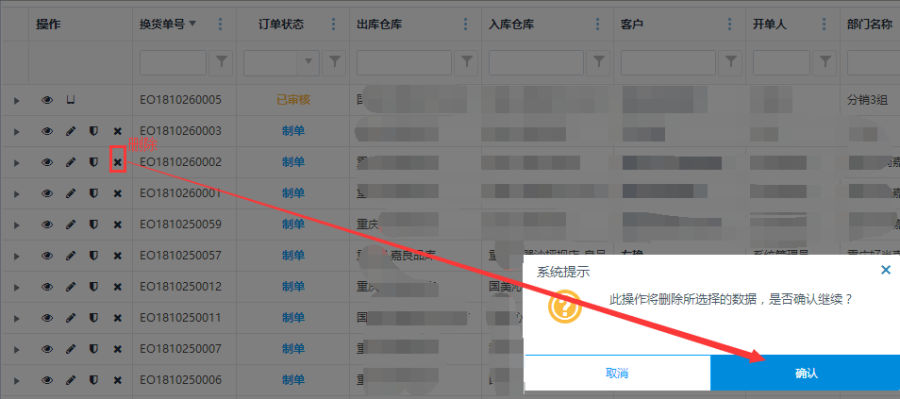 制单状态的销售换货单,点击操作栏<删除>按钮,可删除销售换货订单。