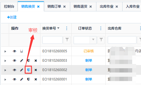 状态为制单的订单,可在销售换货首页操作栏点击<审核>,对订单进行审核操作,销售换货单审核后,状态转为"已审核"并且自动生成一条销售退货单和一条销售订单(从进销存-销售-销售退货(销售订单)出查看)。