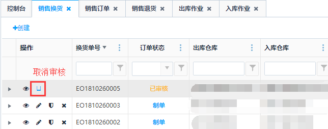 状态为已审核的订单,可在销售换货首页操作栏点击<取消审核>,对订单进行取消审核操作,销售换货单取消审核后,状态转为"制单"。