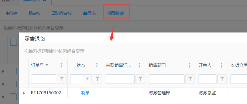 点击列表上方<回收站>按钮,可查看已删除的零售退货单历史记录。