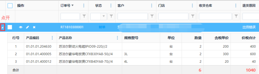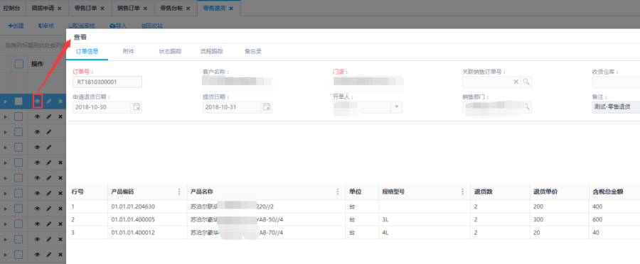 所有状态的订单,点击<查看>按钮,查看当前零售退货单信息详情。界面内容:订单信息、附件、状态跟踪、流程跟踪、备忘录等相应的单号信息;也可以点击最左端的三角形按钮,直接查看订单的产品明细。