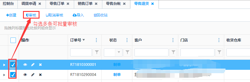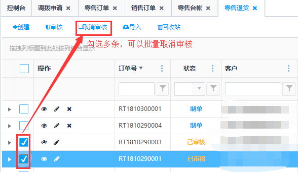 "已审核"状态的零售退货单,可以选中左侧多选框,再点击列表上方<取消审核>按钮,完成取消审核操作,单据状态会转为"制单"。