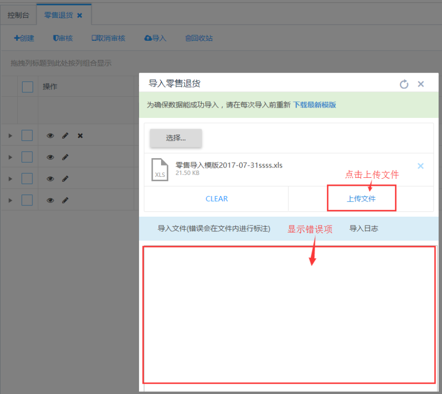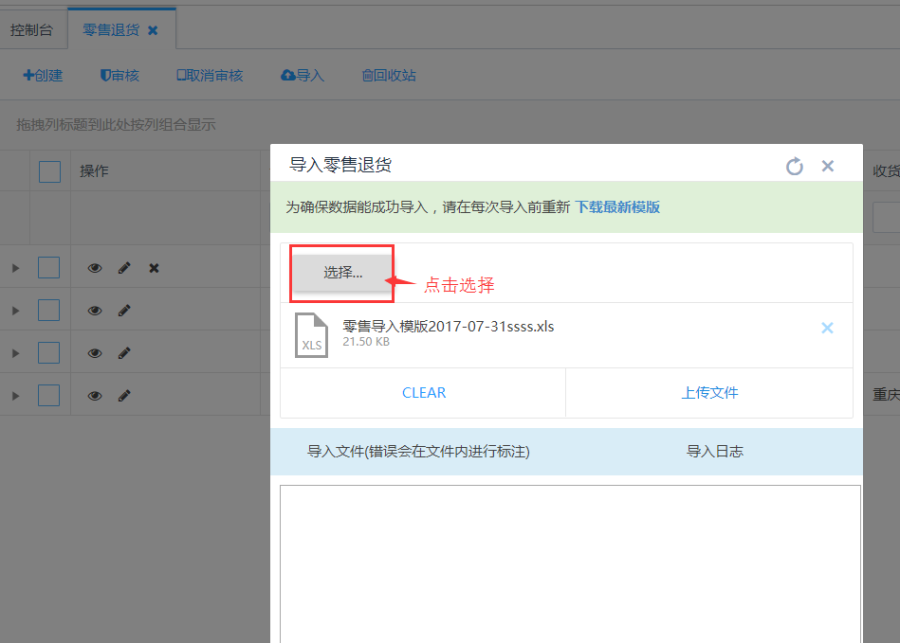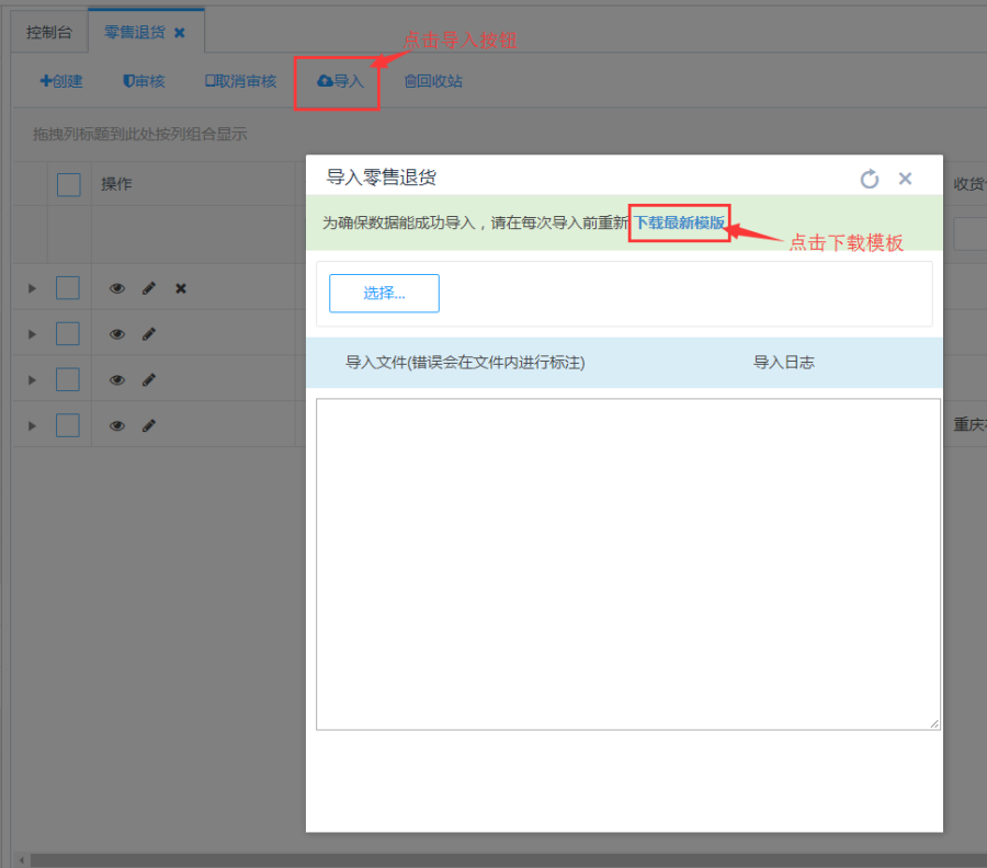第一步:点击列表上方的<导入>按钮,在导入零售退货页面点击<下载最新模板>:
