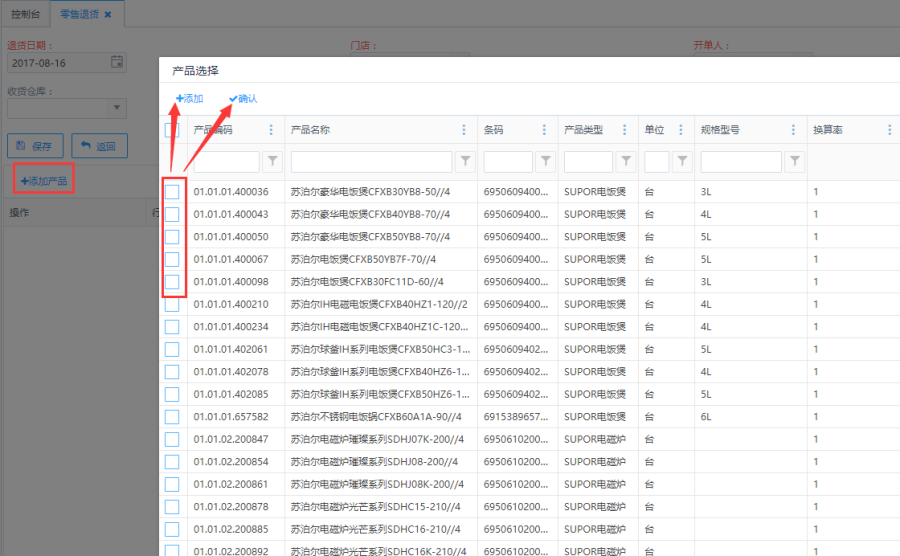 第三步:选中所需添加的产品再点击左上方<添加产品>按钮既可添加产品并可以继续添加产品,如不需继续添加产品,可点击左上方<确认>按钮,既可将之前所有添加的产品添加到零售订单: