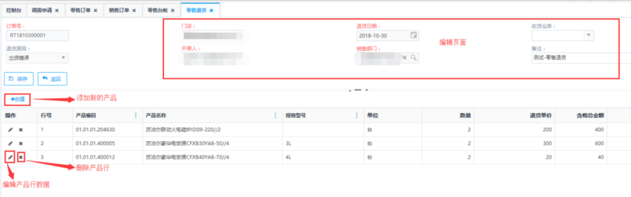 制单状态下的零售退货单,点击<编辑>按钮,可以对零售订单进行编辑操作。
