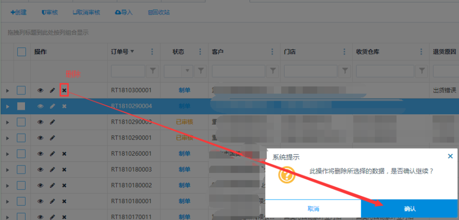 制单状态下的零售退货单,点击操作栏<删除>按钮,可对零售订单进行删除操作。