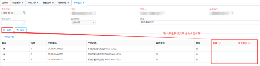 第四步:补全订单产品明细信息,点击<保存>按钮,完成零售退货订单创建。