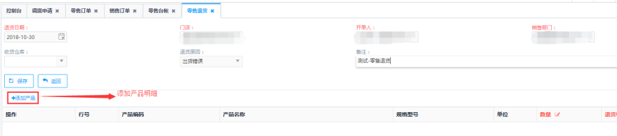 第二步:填写零售退货订单内容,点击<添加产品>按钮,添加零售退货订单明细: