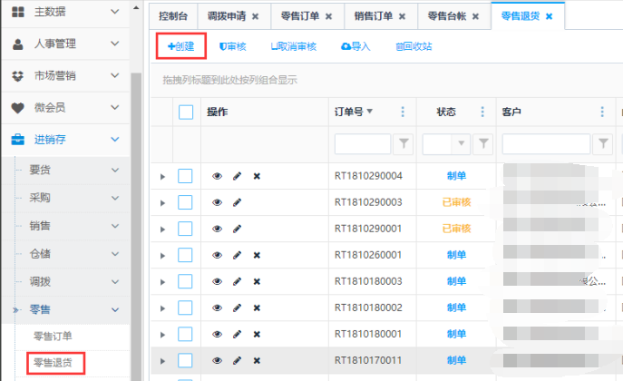 第一步:点击列表上方<创建>按钮,进入零售退货创建页面: