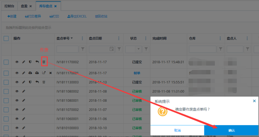 已提交状态的盘点单,可以点击操作栏的<作废>按钮,作废当前盘点单,作废成功后,该盘点单消失。