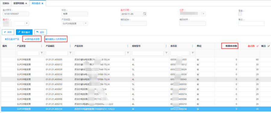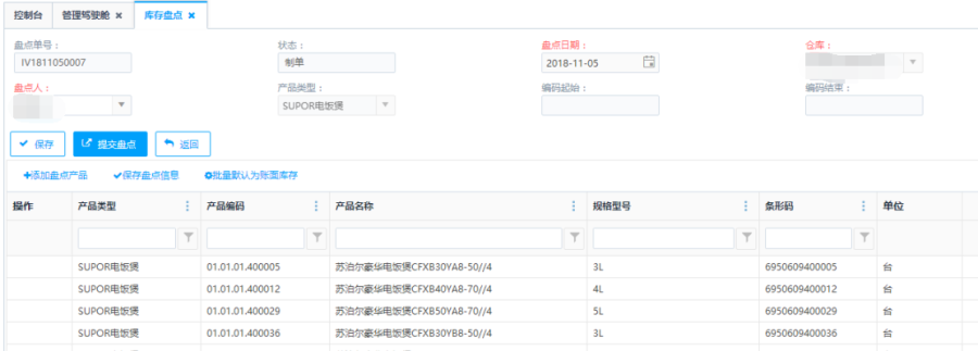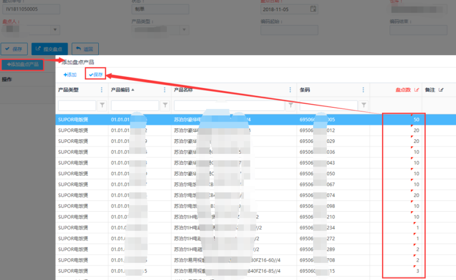第四步:添加盘点产品后,点击<保存>或<提交盘点>按钮,对当前盘点单进行保存操作或者提交盘点操作。