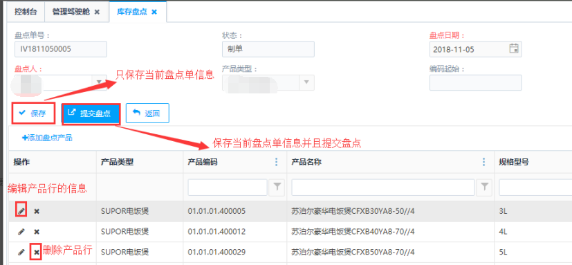 第四步:添加盘点产品后,可以点击<编辑>或<删除>按钮,对产品行进行编辑或删除操作。确认盘点产品信息无误后,点击<保存>或<提交盘点>按钮,对当前盘点单进行保存操作或者提交盘点操作。