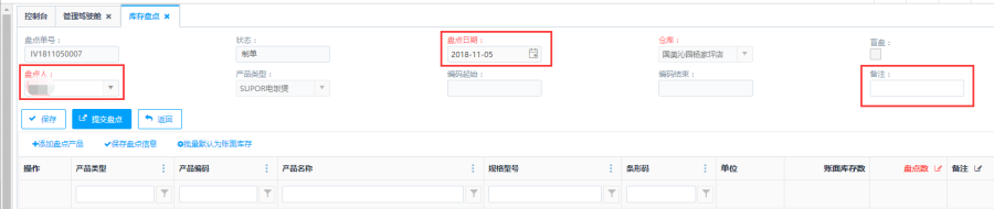 第二步:编辑盘点单的主单信息后点击<添加盘点产品>按钮。