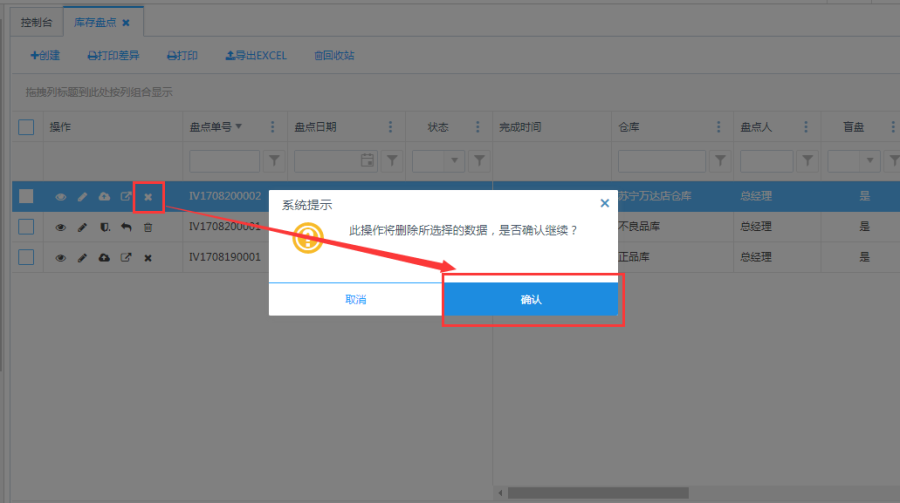 制单/驳回状态的盘点单,点击操作栏<删除>按钮,弹出提示框后点击确认即可删除,删除后单据会进入回收站查看。