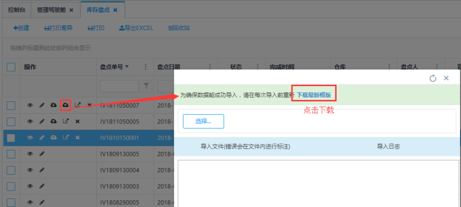 制单状态的盘点单,可以导入手动盘点的结果。注意:若启用扫码盘点则不能操作导入盘点结果。